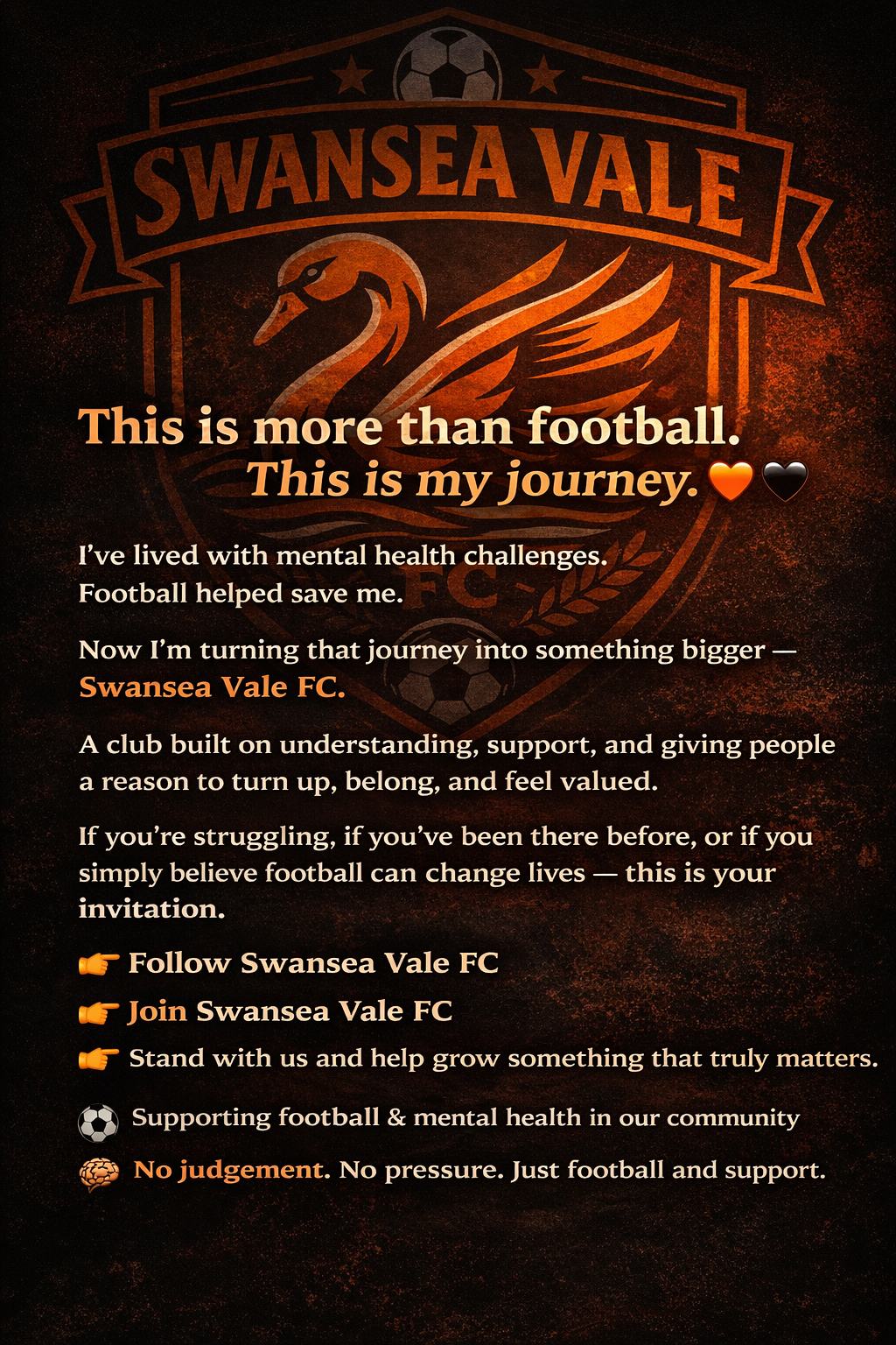 Mental Health is at the heart of Swansea Vale FC. We actively promote positive conversations around mental wellbeing and work to reduce stigma through football, community engagement and partnerships.